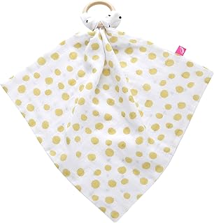 Doudou Double épaisseur en Coton (certifié Öko-Tex Standard 100) avec Anneau de Dentition en Bois, Bois de Teck Naturel – éclaboussure Jaune